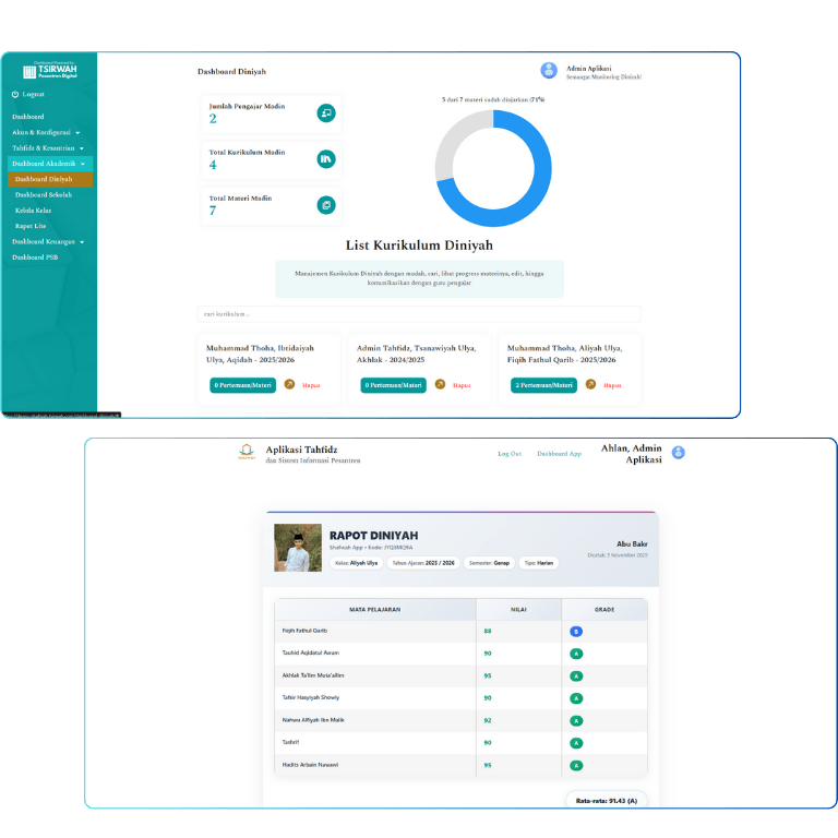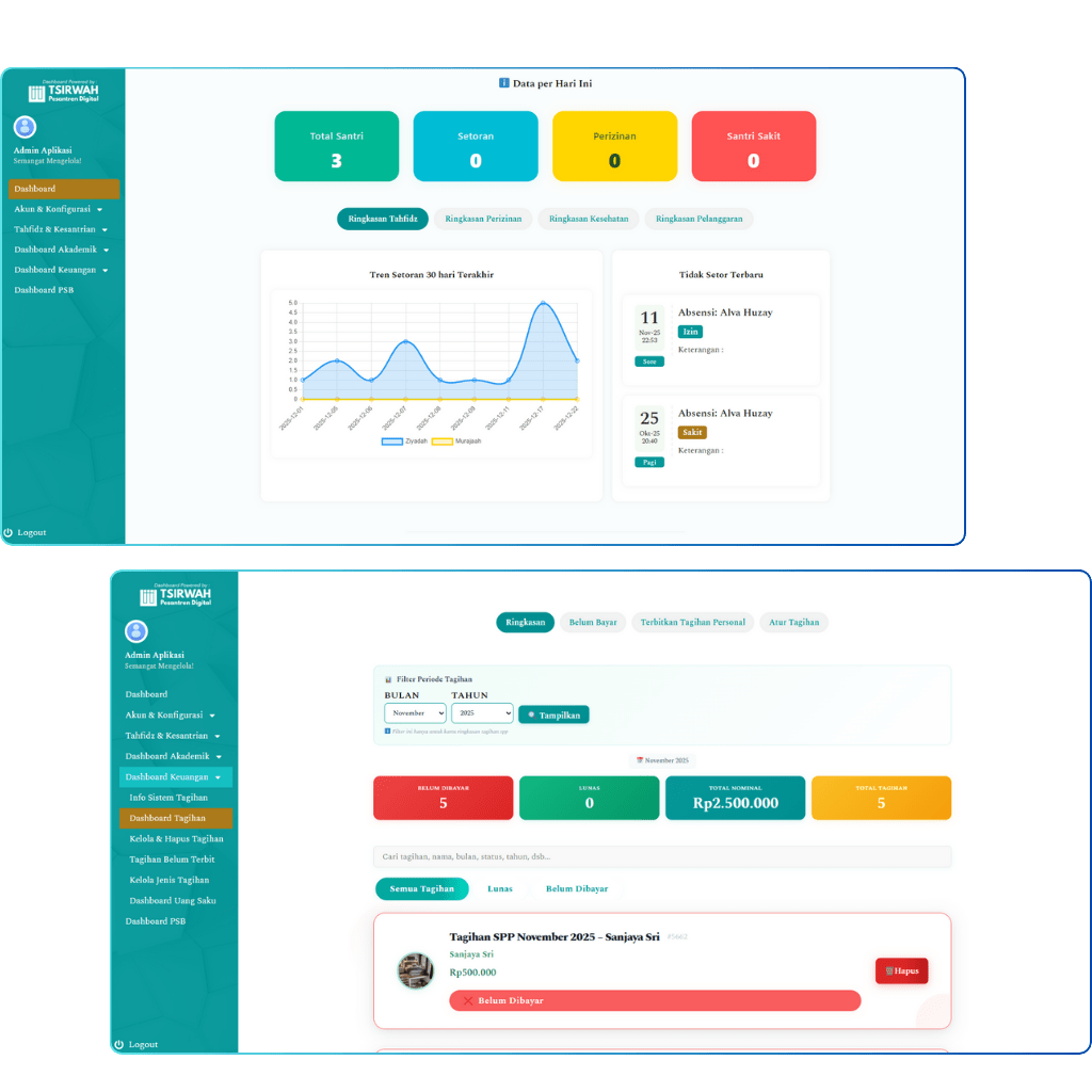 Semua data tahfidz, kesantrian, akademik, dan keuangan tersimpan rapi dalam satu sistem. Hak akses jelas, aset lembaga terjaga.