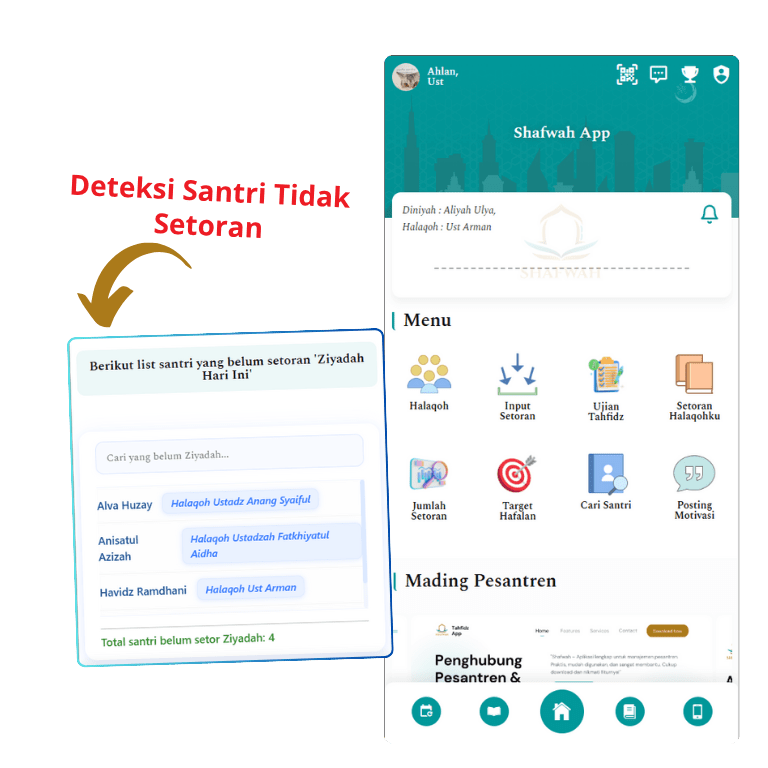 Rekapan otomatis? BISA. Mau tau siapa yang belum setoran? BISA. Download PDF buat laporan? BISA. Ada ujian tasmi’ 5 juz, 10 juz bahkan 30 juz, CATAT DENGAN SHAFWAH!