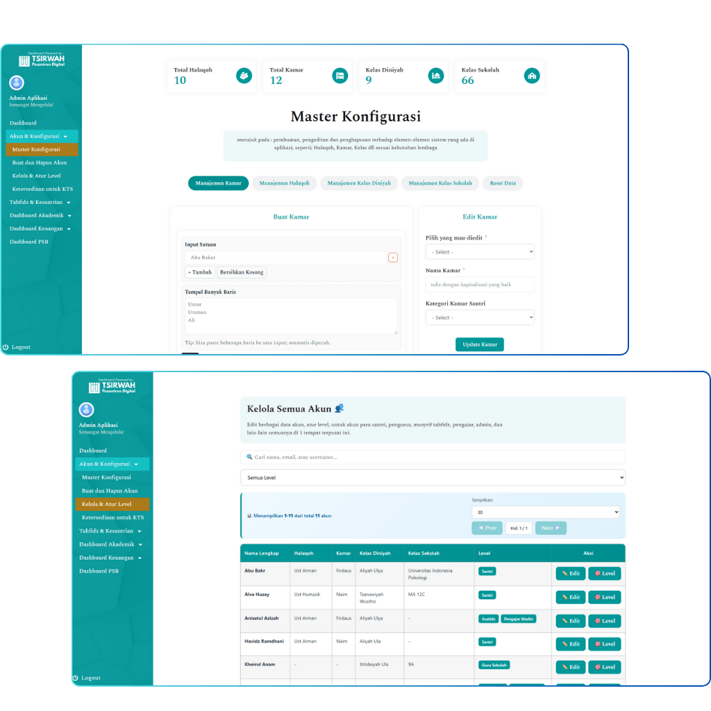Preview Dashboard Admin 2: Master Konfigurasi (setup kamar, halaqoh, kelas2 akademik) & Manajemen Akun (buat, kelola, atur level, hapus, dll).