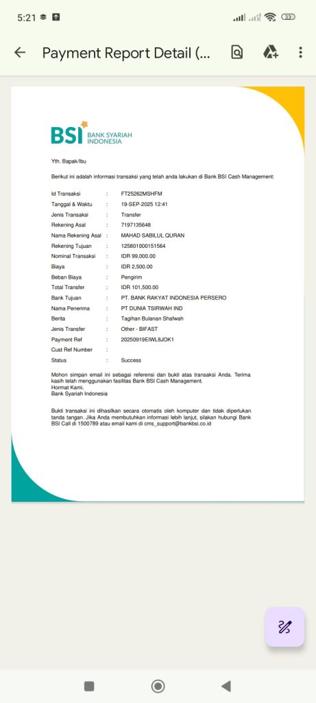 Bayar Tagihan: Baitul Quran BEQI Wonogiri – Sep 2025